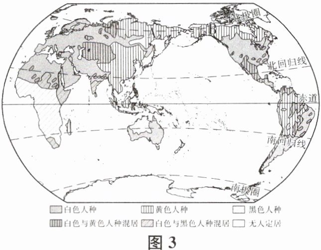6. 图3为“世界人种分布图”。读图完成下列问题。