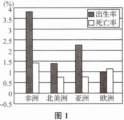 图1为“四大洲人口出生率和死亡率统计图”。读图完成2~3题。