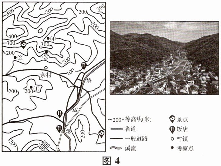为了解浙江省安吉县昔日污染严重的余村转变为绿水青山美丽乡村的过程,某校师生开展了研学考察。图4为“余村及周边等高线地形和景观图”。读图完成7~8题。