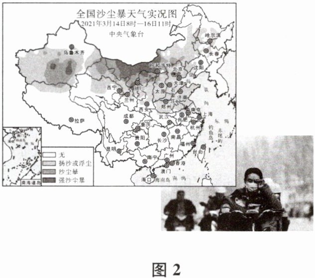 2021年3月14日夜间至16日上午,受蒙古国沙源及强冷空气南下共同影响,我国出现近十年来最强沙尘天气,面积超过380万平方千米。图2示意我国受到此次沙尘天气影响的地区及景观。据此完成9~10题。