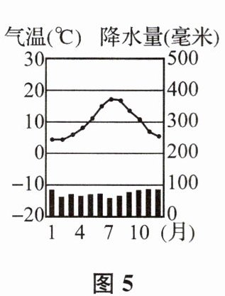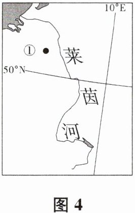莱茵河主要流经西欧平原,是欧洲重要的国际性河流。图 4 为“莱茵河示意图”,图 5 为“莱茵河流域①地气温和降水量统计图”。据此完成 8~10 题。