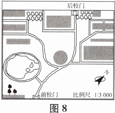 13. 地图是学习地理的第二语言。刚踏进初中的小祖同学非常喜欢他的学校,他绘制了一幅学校的平面图(见图 8)。读图完成下列问题。(7 分)