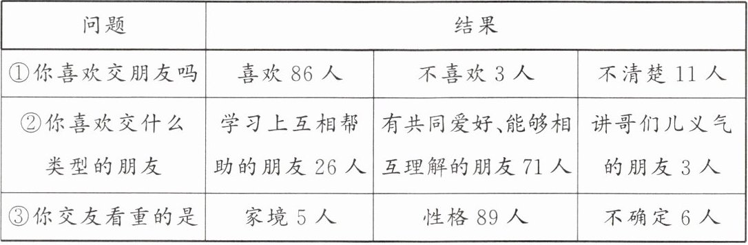 | ①你喜欢交朋友吗 | 喜欢86人 不喜欢3人 不清楚11人 |