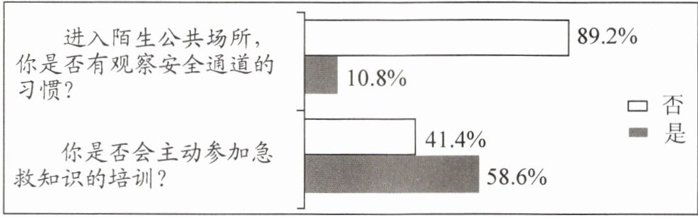 选项①:从数据“进入陌生公共场所,是否有观察安全通道的习惯”中,有$89.2\%$的人否,$10.8\%$的人是,可以看出大部分人缺乏观察安全通道的习惯,这启示我们要增强安全意识,提高安全防范能力,该选项正确。