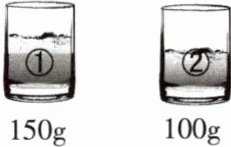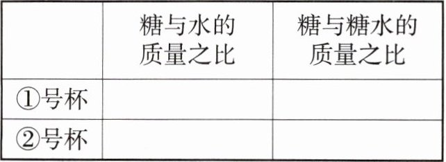 5. 如图所示,每个杯子里分别盛有不同质量的水。现在给①号杯子里放 30g 糖,②号杯子里放 25g 糖。先填表,再解决问题。