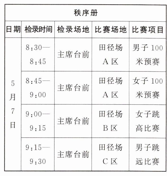 (2)通告组要提醒本班运动员小云参加女子跳高比赛,根据秩序册,应该这样说: