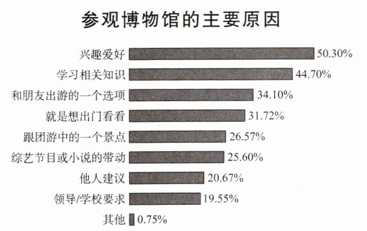 (2)(示例一)人们参观博物馆的主要原因多样,其中兴趣爱好占比最高。(示例二)参观博物馆的人群年龄大多在18~40岁,其中26~30岁的人群占比最高。