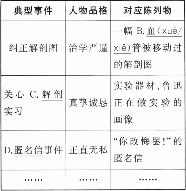 (1)“藤野先生”备展区的小导游们对“陈列表”中个别字词的音、形、义有不同想法,针对他们的四种意见,你认为正确的一项是 (