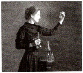 居里夫人身着一袭长裙,显得温文尔雅。她那双微微内陷的眼睛正热切地望着左手玻璃瓶中的镭,这蓝色的镭好像是具有魔力的蓝色精灵,深深地吸引着居里夫人的目光。
