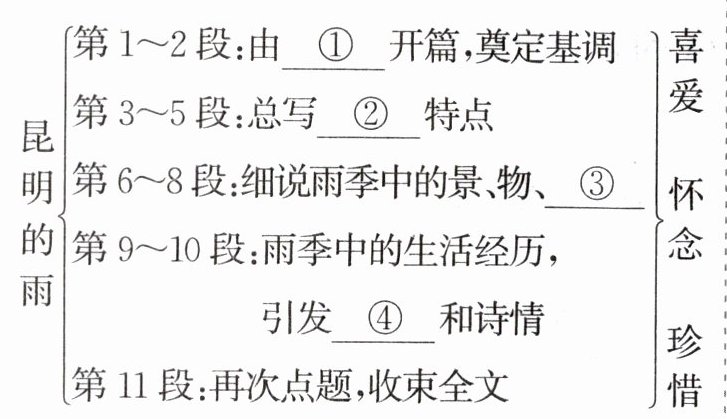 (2)"我"之所以"想念昆明的雨",究其原因,是昆明的雨让"我"感受到了它特有的美:景物的美、滋味的美、人情的美、氛围的美。