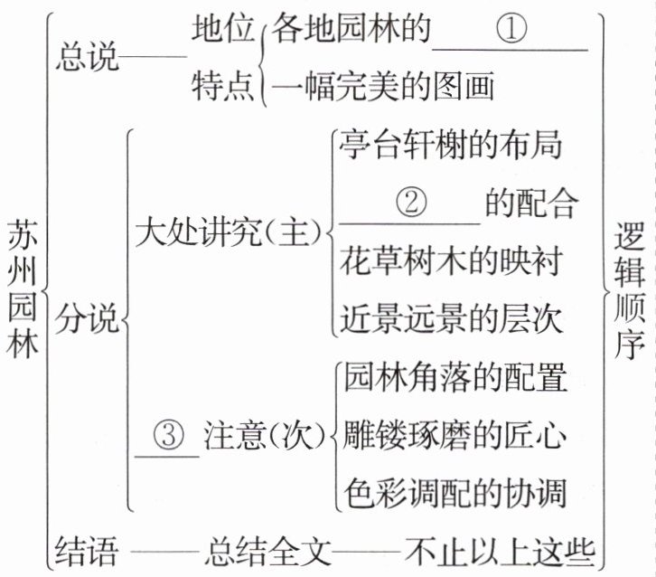 (2)①文章采用了先总后分的逻辑顺序。先点出苏州园林的整体特征,然后从亭台轩榭的布局、假山池沼的配合、花草树木的映衬、近景远景的层次及每个角落、门窗、色彩七个方面展开介绍。②全文按照从整体到局部,局部由主到次的顺序进行有条理的说明。这样,读者不仅领略到了苏州园林的整体美,也获得了具体感受。
