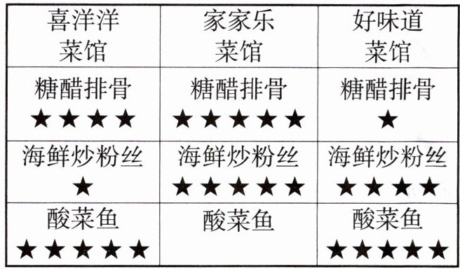 4. 下面是三家菜馆的客人对菜品喜欢程度的统计表(“★”越多表示客人越喜欢)。某天,有100位客人在其中一家菜馆用餐,40位客人点了“海鲜炒粉丝”,50位客人点了“酸菜鱼”,用餐后都很满意,你认为他们最有可能是在哪家菜馆用餐的? 说说你的理由。