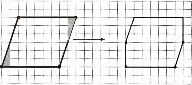 1. 在将平行四边形转化成长方形时,小明剪下了左边平行四边形的阴影部分,他应该将阴影部分拼在右图的什么地方?请先在方格纸上画出来,再填空。