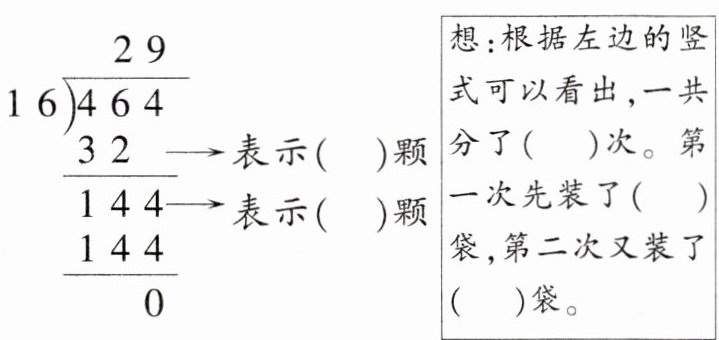 (1)学校开展义卖活动,四年级(1)班同学制作了464颗手工糖果,计划每16颗装成一袋,能装多少袋?竖式计算过程如下: