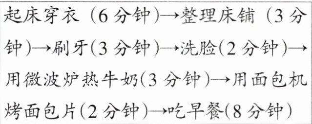 起床穿衣(6分钟)→用微波炉热牛奶(3分钟,同时整理床铺)→用面包机烤面包片(2分钟,同时刷牙)→洗脸(2分钟)→吃早餐(8分钟)。