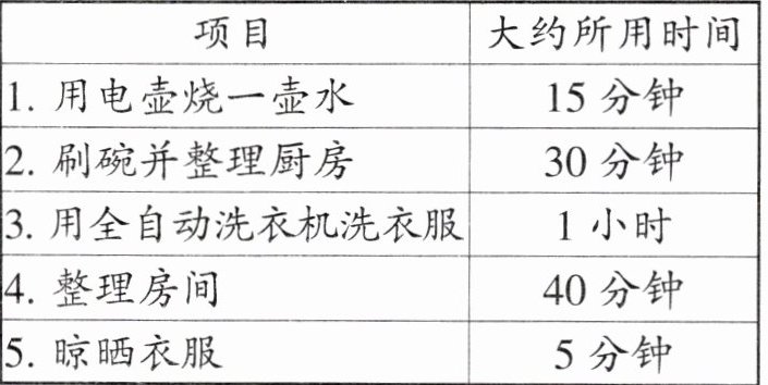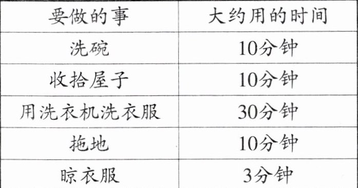 明明的妈妈要做表中的几件事,请你帮忙安排她做事的顺序,使所用的时间最少。最少需要多长时间?
