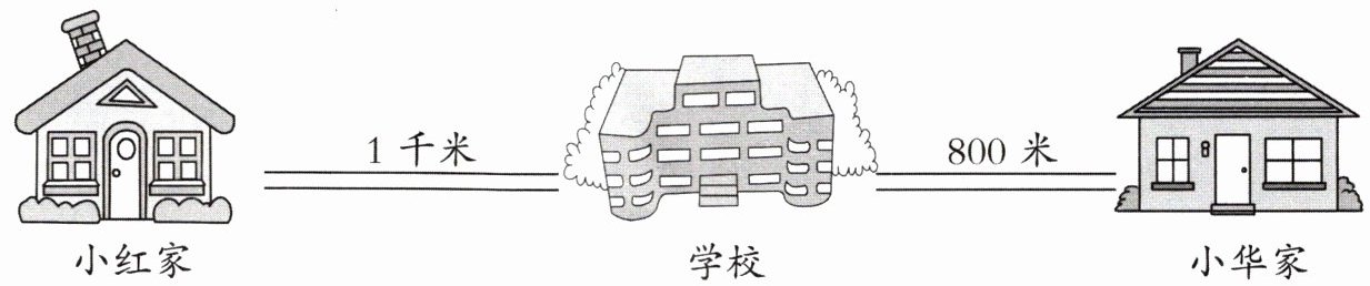 5. 星期天,小红到小华家做作业。小红走到学校门口,发现作业本忘在家中,立即返回家中取作业本,再到小华家。这时,小红一共走了多少米?