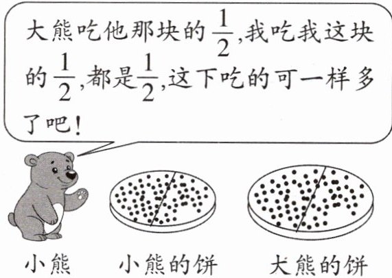 (2)不对,不一样多。因为饼的大小不同,$\frac{1}{2}$的大小也不同。