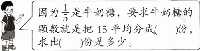 因为$\frac{1}{5}$是牛奶糖,要求牛奶糖的颗数就是把 15 平均分成(