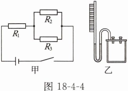13. 小明为了探究电流产生的热量与电流大小的关系,利用阻值相等的电阻丝$R_1、$$R_2、$$R_3,$设计了如图18-4-4甲所示电路,将电阻丝$R_3$和