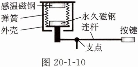 煮饭时,按下电饭锅的按键,永久磁钢和感温磁钢吸合,同时带动连杆使加热开关(图中未画出)闭合,电热盘通电,当温度升高到一定程度时,感温磁钢失去磁性,在弹簧的作用下感温磁钢与永久磁钢分离,使按键跳起,同时使加热开关断开,电热盘停止加热。