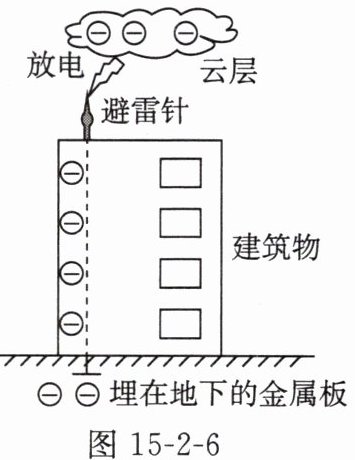 11. 如图15-2-6,带负电的云层靠近建筑物上的避雷针时,向避雷针剧烈放电形成雷电,下列说法正确的是(