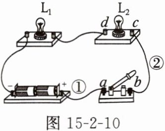 17. 如图15-2-10所示的电路中,闭合开关后两灯泡都不发光。为了寻找灯泡不亮的原因,将一根完好的导线一端固定在电源正极,另一端依次接触a、b、c、d四个接线柱,发现只有与d接线柱接触时灯泡$L_1$才发光。若电路中只有一处断路,位置可能是(