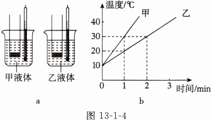 15. 探究“不同物质的吸热本领”的实验装置如图$13 - 1 - 4a$所示,用相同的电加热器给初温及质量均相同的甲、乙两种不同的液体加热,两种液体每秒吸收的热量相同,两种液体的温度随加热时间变化的图像如图$13 - 1 - 4b$所示。