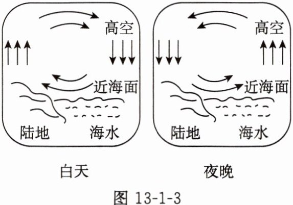 14. 炎炎夏日,小梅来到美丽的海滨城市青岛。她发现,在这里白天的风常常从海面吹向陆地,而每到夜晚风却从陆地吹向海面。她利用学过的物理知识进行分析,并画出了陆地和海面之间空气流动情况的示意图,如图$13 - 1 - 3$所示。形成这一现象的主要原因是(