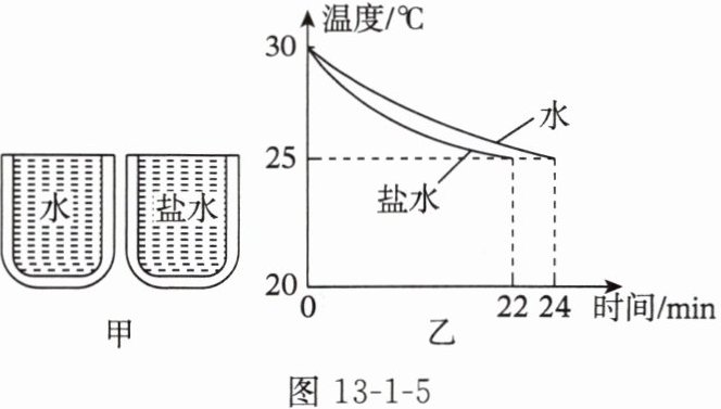 。(3)如图$13 - 1 - 5$甲所示,用两个同样的保温杯分别装满水和盐水,水和盐水的温度都是$30\ ℃$,周围环境温度保持$20\ ℃$不变,保温杯敞开口,水和盐水温度随时间变化的关系图像如图$13 - 1 - 5$乙所示,已知水的比热容为$4.2× 10^{3}\ J/(kg\cdot ℃)$,盐水的密度为$1.1× 10^{3}\ kg/m^{3}$,则盐水的比热容为