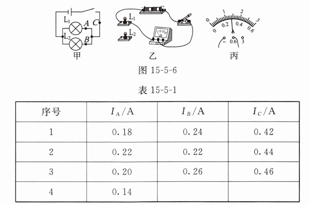 (2)用电流表分别测量A、B、C三点的电流,更换灯泡多次测量,将实验数据记录在表15-5-1中,其中第4次实验中B点的电流如图15-5-6丙所示,则Iᵦ= ______A;分析数据可知:并联电路中电流的特点是______。