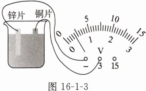 9. 如图16-1-3所示,在烧杯中加入盐水,然后将连在电压表上的铜片和锌片插入盐水中,这样就制成了一个盐水电池。观察电压表的接线和指针偏转,下列说法正确的是(