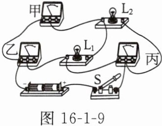 15. 如图16-1-9所示的实物电路由电源、开关S、两个小灯泡$L_1、$$L_2$和甲、乙、丙三个电表(电流表或电压表)组成。闭合开关S后,两个小灯泡$L_1、$$L_2$均能发光。关于甲、乙、丙三个电表的判断,下列选项正确的是(