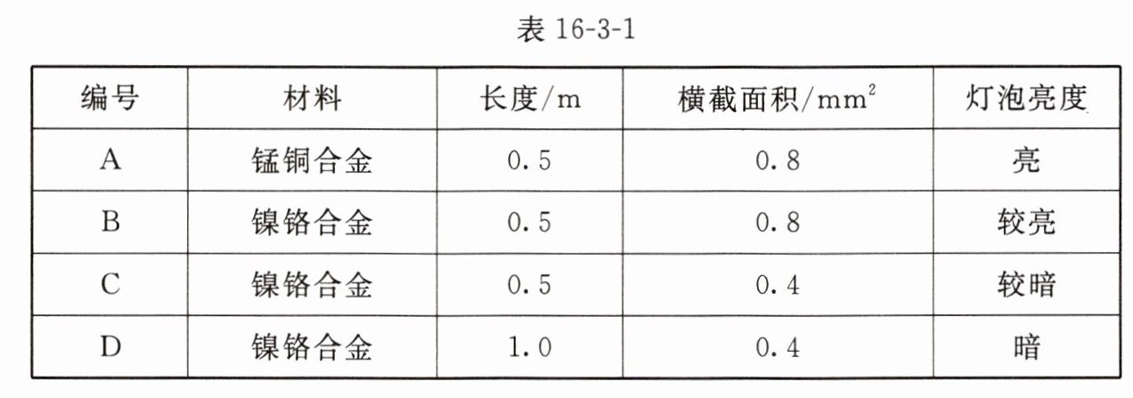 17. “探究影响导体电阻大小的因素”的实验装置如图16-3-7所示,在实验中使用四根电阻丝,其材料规格如表16-3-1所示。