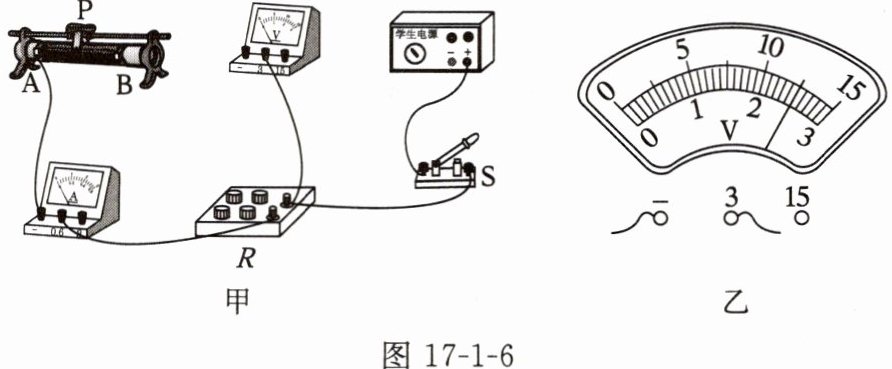 (1)请用笔画线代替导线,将图17-1-6甲的实物图连接完整,要求滑动变阻器的滑片$P$向右滑动时,接入电路的电阻变大。