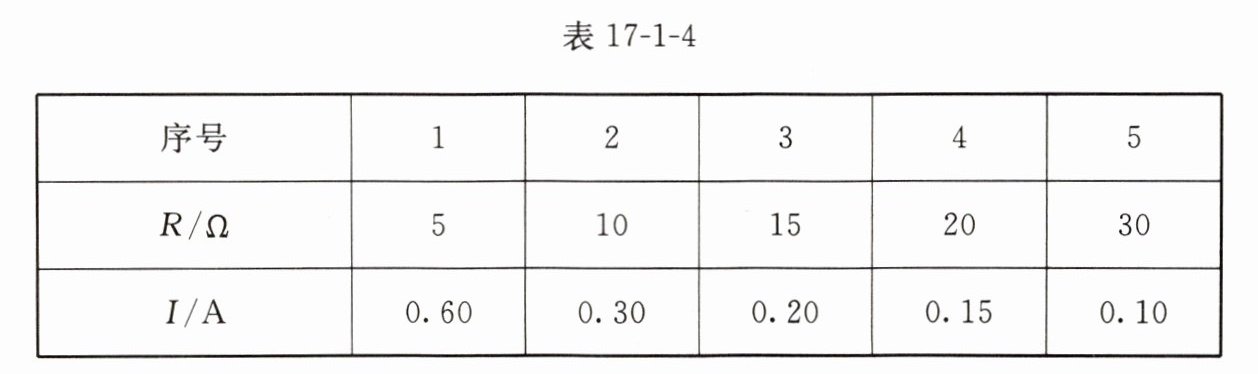 (4)小明实验时控制电压表的示数$U = 3V$一定,通过移动变阻器滑片$P和改变电阻箱R$接入电路的阻值,进行了$5$次实验,测得了表17-1-4中的数据,通过分析实验数据可得出通过导体的电流与______的关系,本实验研究物理问题所用的方法是______。