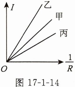 ③小明按正确操作重新进行实验,他得到的电流$I与定值电阻R$的倒数关系应为图17-1-14中的图线______(选填“甲”“乙”或“丙”)。