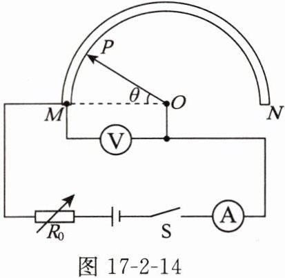 18. 新房装修时,工人经常用普通量角器测量一些角度,不方便读数。小明根据所学的知识设计了电子量角器,电路如图 17-2-14 所示,电流表的测量范围为 $ 0\sim0.6 A $,电压表的测量范围为 $ 0\sim3 V $,$ O $ 为半圆弧电阻 $ MN $ 的圆心,金属滑片 $ OP $ 为半径,与半圆弧接触良好,接入电路的电阻 $ R_{MP} $ 与指针旋转角度 $ \theta $ 成正比,电源电压恒为 $ 6 V $,$ R_0 $ 为电阻箱。将滑片 $ OP $ 旋转至 $ M $ 处,闭合开关,调节 $ R_0 $ 的阻值,使电路中电流为 $ 0.6 A $。