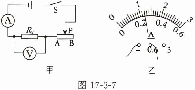 端。(3)当电压表示数为2.4V时,电流表示数如图17-3-7乙所示,则通过Rₓ的电流为