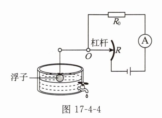 9. 图17-4-4是一种测定油箱内油量的装置。其中$R$是滑动变阻器的电阻片,杠杆的右端是滑动变阻器的滑片,杠杆左端固定着一个浮子,油箱内油量变化时,滑片就在电阻片$R$两端之间滑动。下列说法错误的是(