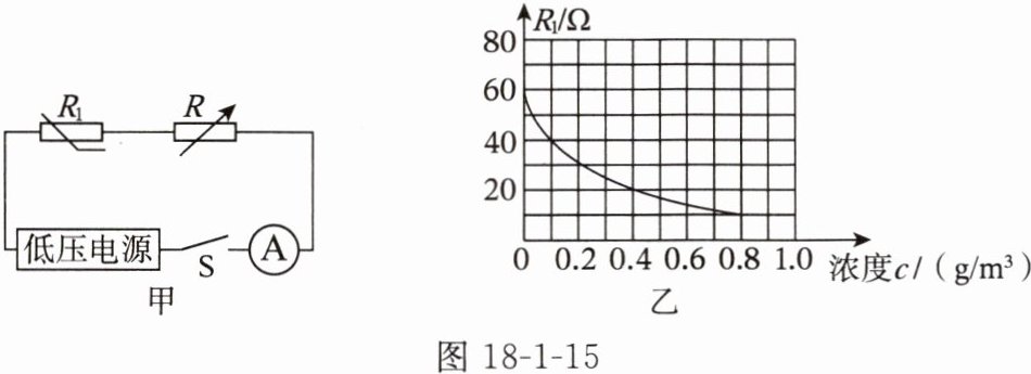 20. 某物理兴趣小组设计了一简易燃气报警器,图 18 - 1 - 15 甲是模拟燃气泄漏检测原理图,电源电压恒为$ 12V,R_1 $为气敏电阻,其阻值随燃气浓度的升高而减小,R 为可调试变阻器,气敏电阻$ R_1 $的阻值与天然气浓度间的关系如图 18 - 1 - 15 乙所示,当天然气浓度达到$ 0.8g/m^3,$电路中的电流为 0.4A,燃气报警器报警。