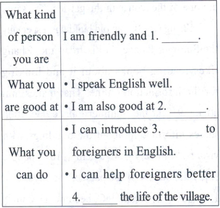 First of all, I am friendly and patient. I am active in many activities. Besides, I speak English well and have won several prizes in English speaking competitions. I am also good at telling stories. So I can introduce local culture to foreigners in English. Most importantly, I have visited the beautiful village many times and I can help foreigners better understand the life of the village.