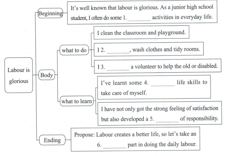 劳动创造美好生活,劳动实践从我做起。请阅读下面短文,根据短文内容完成思维导图,掌握短文结构及写作思路。