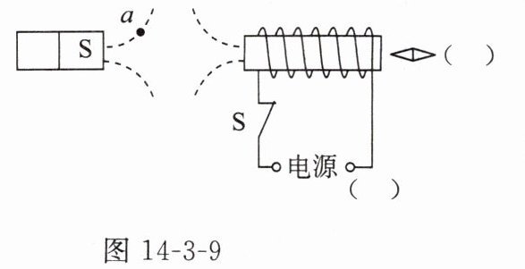 4. 在通电螺线管左侧放一条形磁体,闭合开关S后,小磁针静止在如图14-3-9所示的位置。请标出电源右侧的极性(标“$ + $”或“$ - $”)、a点的磁感线方向、小磁针静止时右端的磁极极性(标“N”或“S”)。