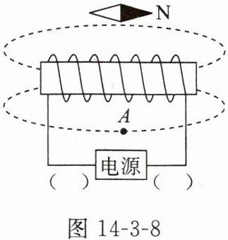 3. 如图14-3-8所示,请根据小磁针静止时N极的指向标出A处的磁感线方向和电源的正、负极。