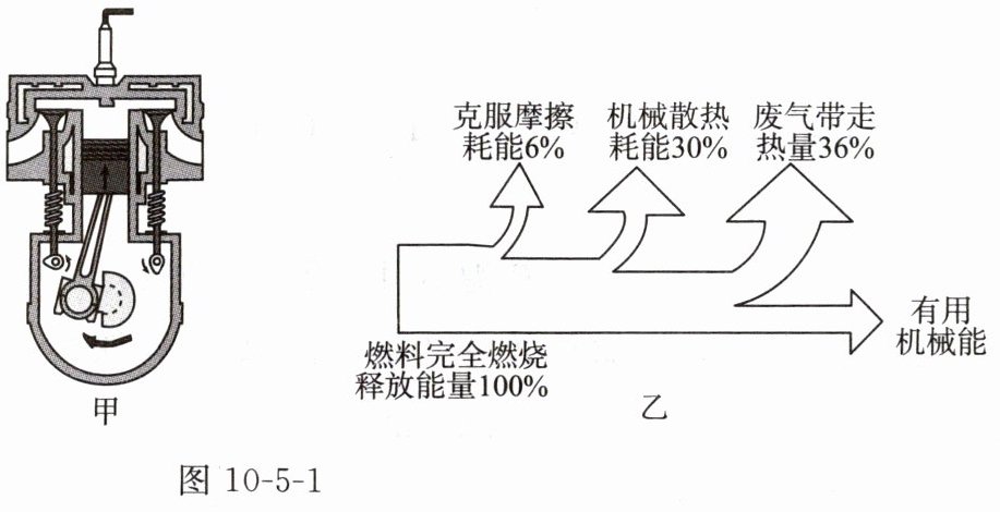 3. 汽车是现代生活中常见的一种交通工具,它的发动机一般为汽油机。图10-5-1甲、乙分别是某汽油机的某冲程工作示意图、能量流向图。下列有关说法正确的是(