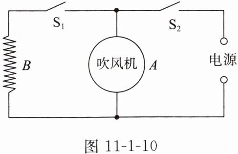 5. 图 11 - 1 - 10 是一个能吹出冷风和热风的电吹风机简化电路图,图中 A 是吹风机,B 是电热丝。闭合开关