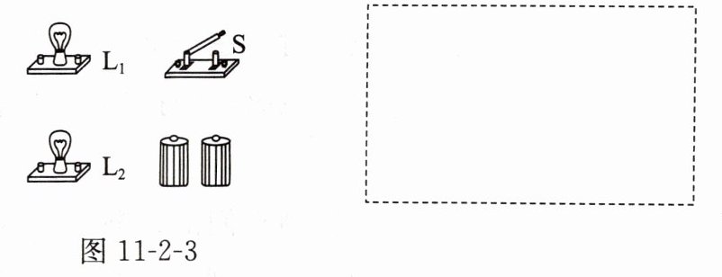 3. 请用笔画线代替导线,把图 11 - 2 - 3 中的各元件连接起来,要求:开关控制 $ L_{1} $ 和 $ L_{2} $,$ L_{1} $ 和 $ L_{2} $ 串联在电路中,并在虚线框内画出对应的电路图。