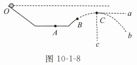 (3)如图 10 - 1 - 8 所示的实验中,让小球从一光滑斜槽轨道(OAB)的 O 点由静止滚下,经过 A 点、B 点到达 C 点。忽略空气阻力,设小球在 A、B 两点的机械能分别为 $ E_A $ 和 $ E_B $,则 $ E_A $______(选填“$ > $”“$ < $”或“$ = $”)$ E_B $。当小球从 B 点离开轨道运动到最高点 C 时,若小球所受的外力全部消失,则小球将______(填选项字母)。