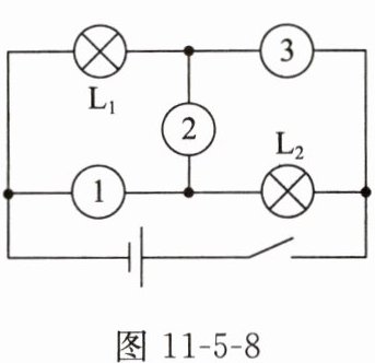5. 如图11 - 5 - 8所示,已知两只灯泡$L_1$和$L_2$串联,则关于①、②和③三块电表(电流表或电压表)的判断正确的是(
